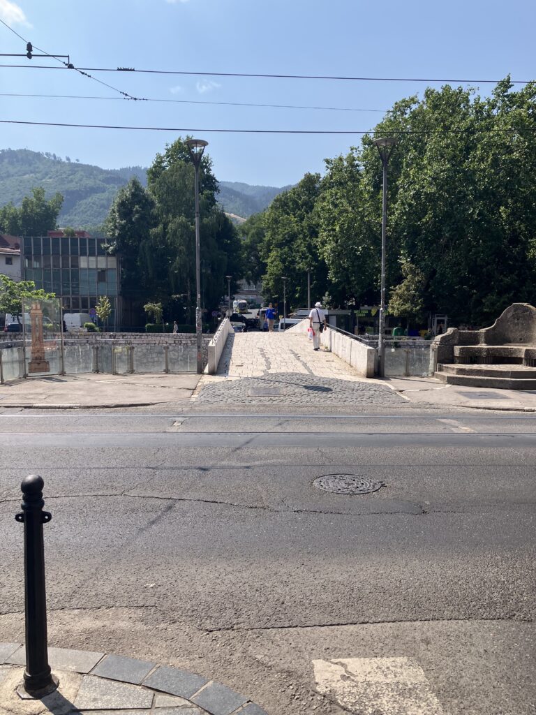 この足跡から左を見ると、オーストリアの皇太子夫妻が通ったとされる道路とラテン橋