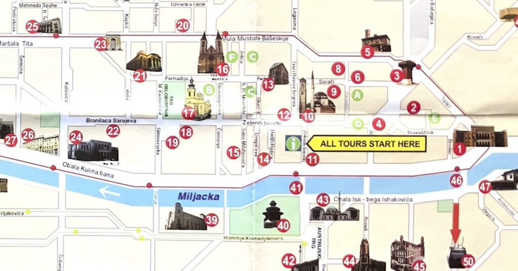 この日に回ったのは、下の地図の3から23への道、サラエボ事件の場所が11です。