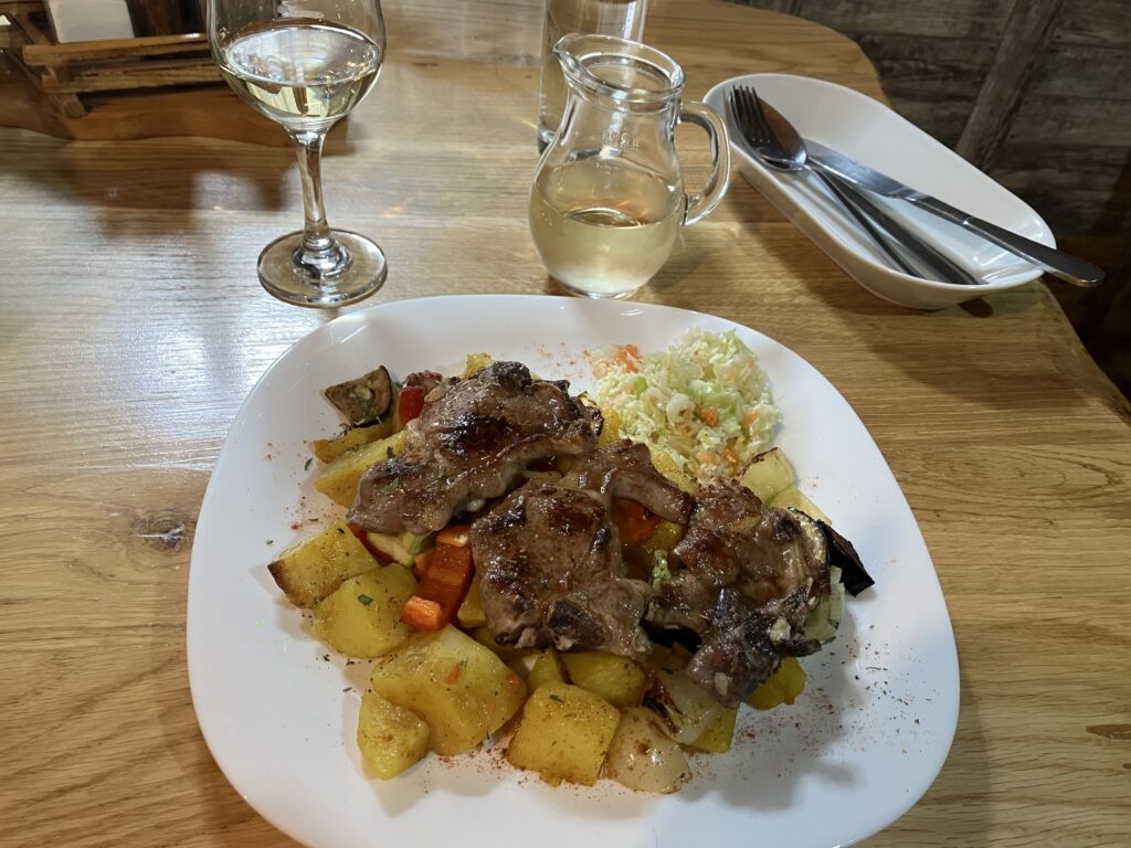 料理の名前は忘れましたが、こちらの料理はラム肉とジャガイモです。白と赤のワインも注文。